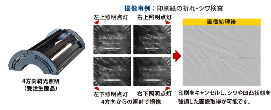 1ステージで4方向から照射して撮像し、ワーク表面の模様を消してシワや凹凸を捉えやすい画像取得ができます。
