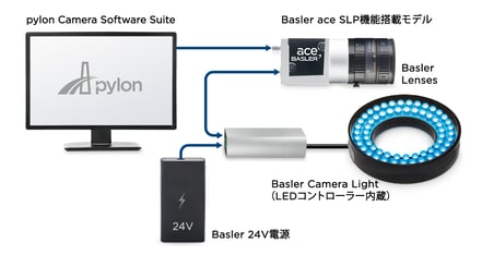 『Basler Camera Light』は、Basler社のカメラ「ace U」、「ace L」シリーズ向けに設計しており、Basler SLPという独自のプロトコルを使っています。このプロトコルによって、上記のカメラとLED照明の間の通信がケーブル一本で可能となり、Baslerカメラのソフトウエアを使って照明の設定を行うことができます。