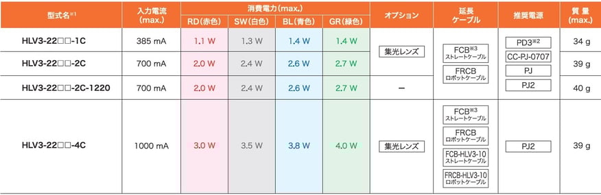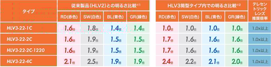 ※2 『HLV3シリーズ 筒型タイプ』内での明るさ比較は、HLV3-22-1Cの各発光色を基準値とした際の比較です。