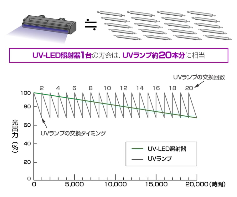 ランプ方式のUV照射器をLED方式に置き換えることにより、寿命を伸ばすことができます。